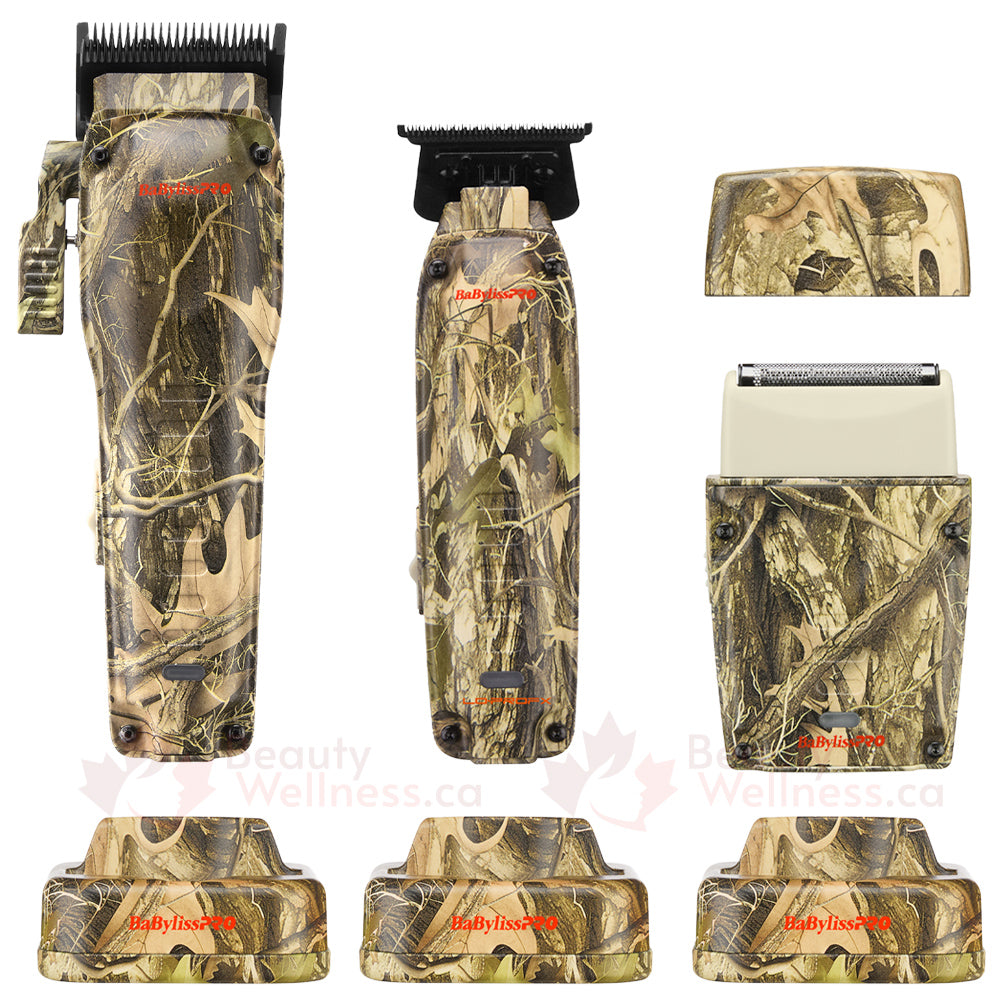 THIS CAMO SUPER TRIO INCLUDES: 1x FX82CAM Clipper 1x FX72CAM Trimmer 1x FXLPFS1CAM Single Foil Shaver BaBylissPRO Camo Clipper & Stand • FX82CAM LO-PROFX Compact Clipper & Charging Stand Limited Edition Collection Hydro-dipped Ergonomic Housing...